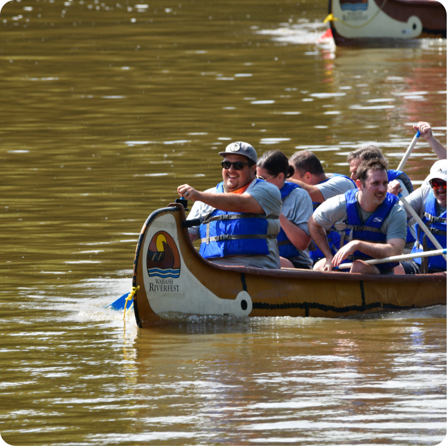 The Voyageur canoe races are a highlight of Wabash Riverfest. Teams of 10 sprint down the Wabash in the huge canoes. Teams can be formed with colleagues, friends, family members, churches, or clubs. Paddlers must be 10 years or older, must sign a waiver, and must wear a life jacket. We’ll have someone on hand to steer the boat and give a crash course in paddling.